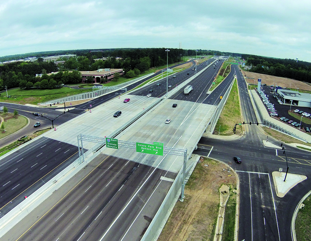 Among our innovations for the project was the design and development of Colony Park Boulevard, a new east-west route for the city of Ridgeland that provides access to the interstate in a growing area. Rather than construct the new roadway over the interstate and hinder future growth, we designed the road to pass under I-55. To accomplish this, we created a complex system to alternate head-to-head traffic on the northbound and southbound lanes of the interstate. Crews then constructed the bridges on top of the existing ground using drilled shafts and temporary casings prior to pouring the caps, placing the beams and pouring the deck. Once the new bridges were in place, workers excavated the ground below the interstate for the development of the new roadway.