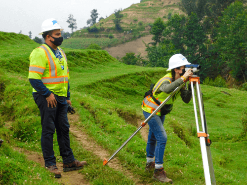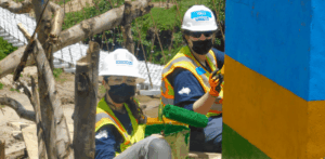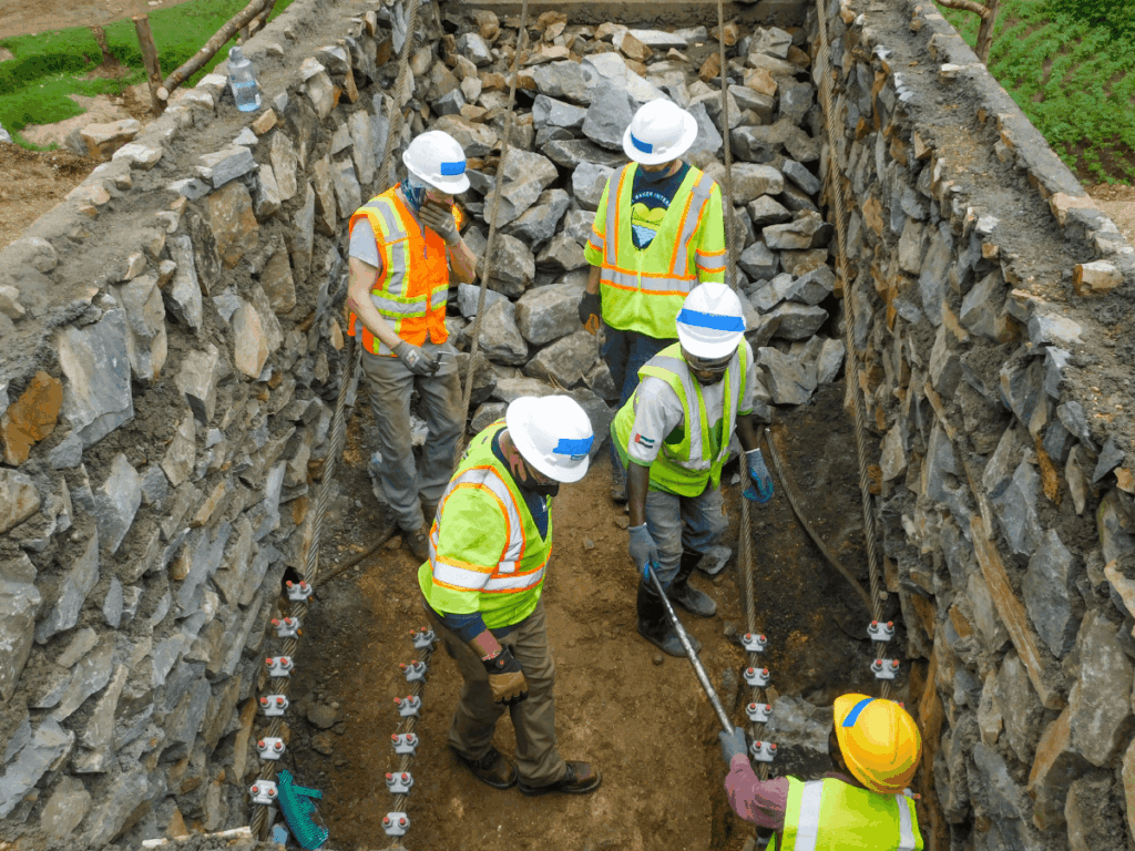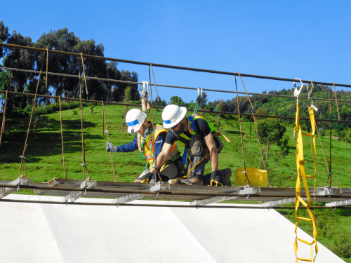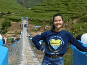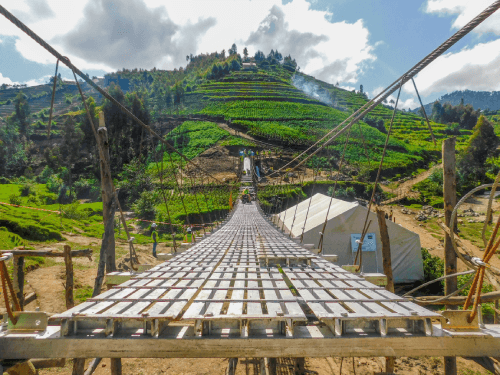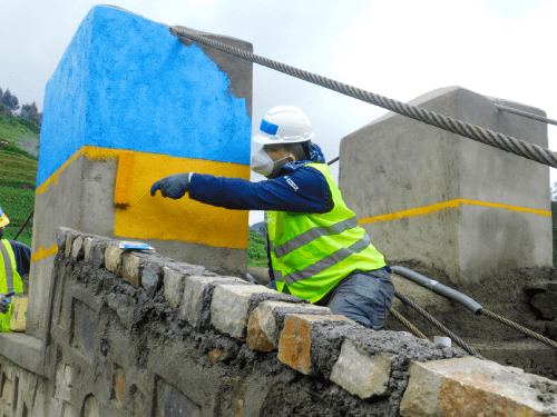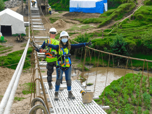 The team arrived in Rwanda ready to work, diving right in with surveying and anchoring cables. Despite some rainy days during their first week on the ground, the team cut and bent rebar hangers, backfilled the abutments with large rocks and launched the decking crossbeams. They also painted the tower supports blue, yellow and green – the colors of the Rwandan flag. They made significant progress during the second week, installing decking panels and fencing, tensioning cables and constructing retaining walls in partnership with B2P engineers and local volunteers.