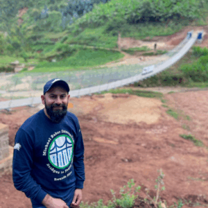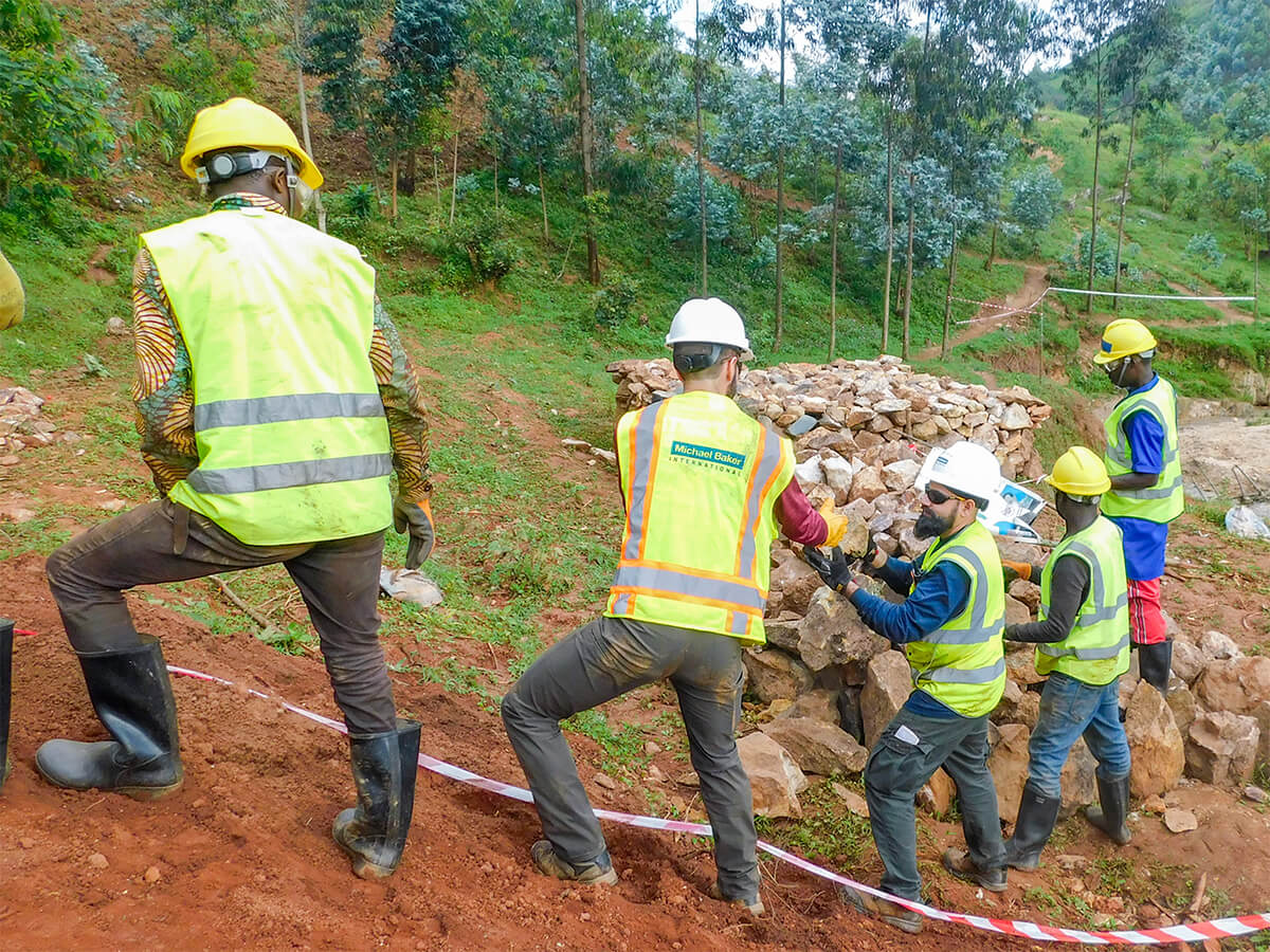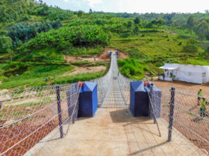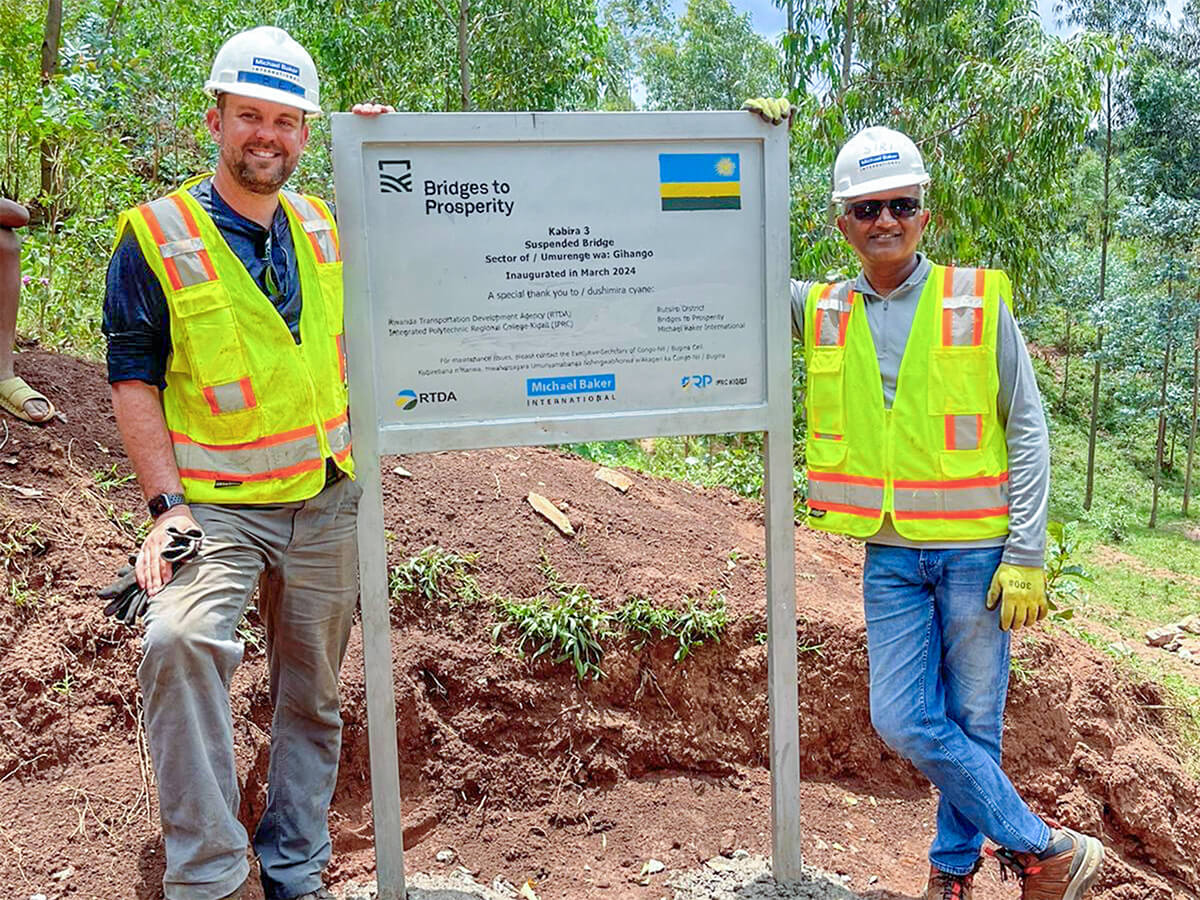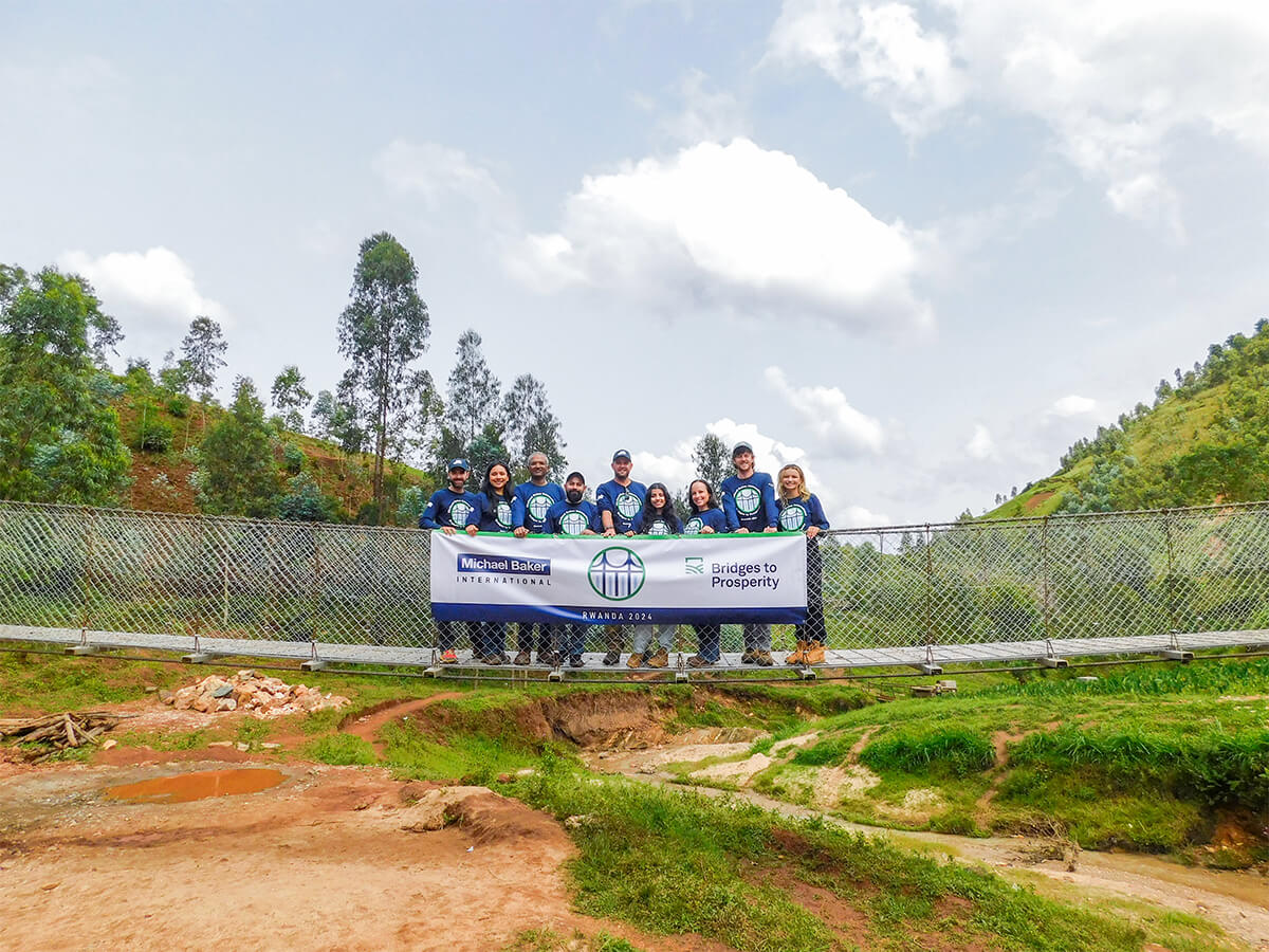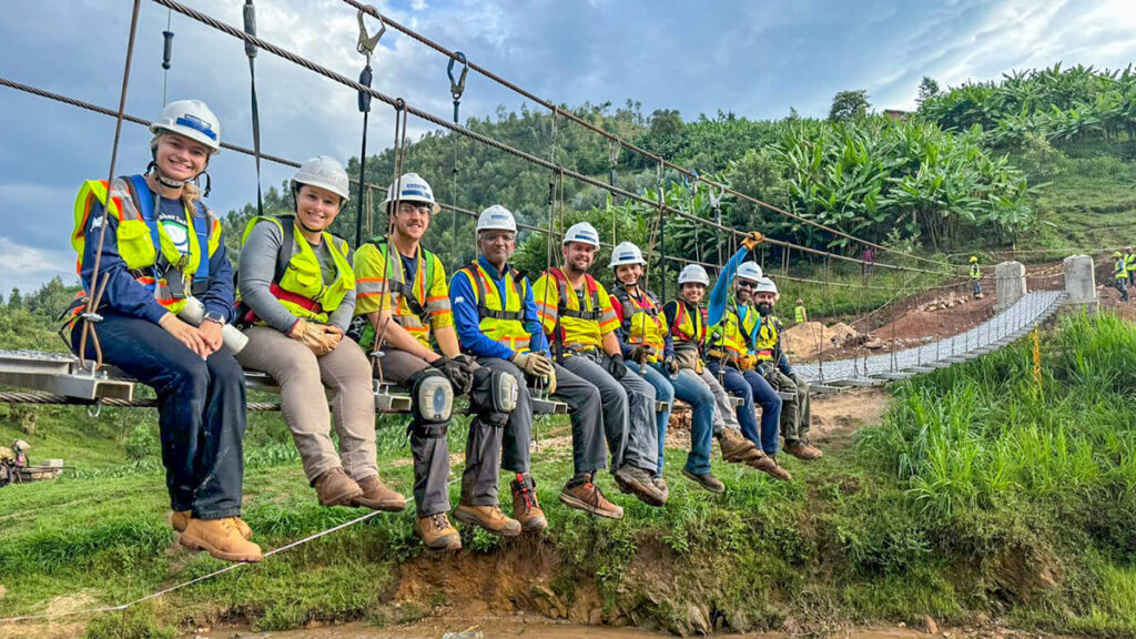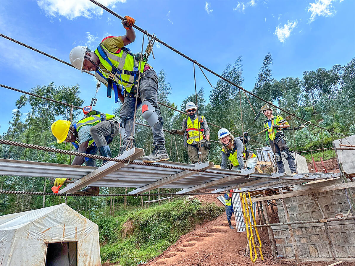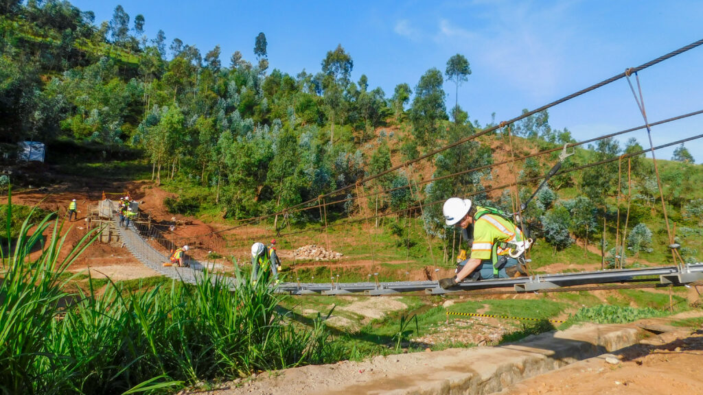 A team of Michael Baker International employees from across the United States traveled to Rwanda to construct the Kabira 3 trail bridge in partnership with B2P staff and local community members. Over the course of two weeks, the team successfully constructed a 157-foot-long suspended footbridge to enable safe crossing over the Mukebera River.