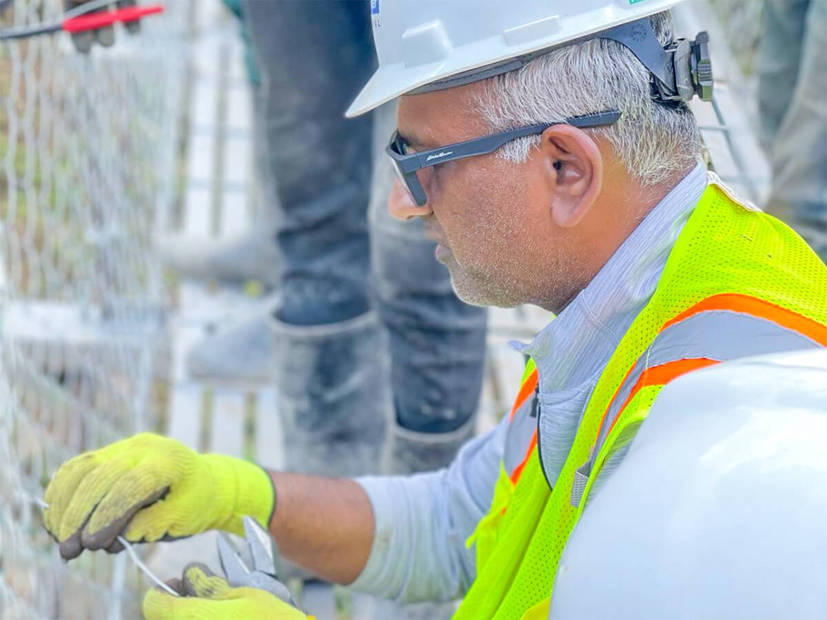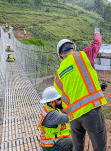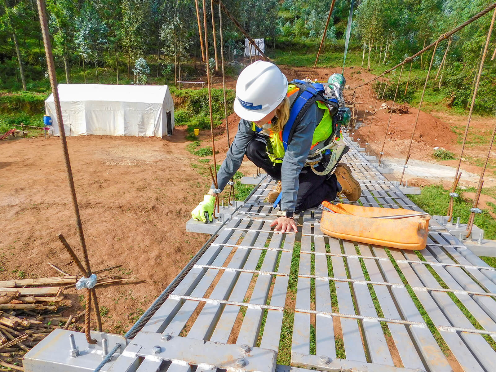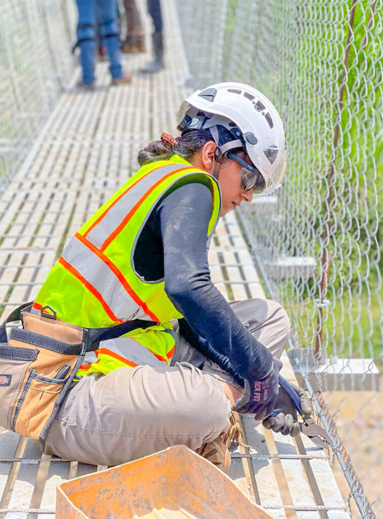 Though the construction team members spoke various languages and came from different backgrounds, the group worked together as a team to achieve their shared goal of constructing the Kabira 3 trail bridge. They started by setting the cables for the bridge, backfilling a concrete abutment with large rocks and prepping the decking panels. Next, the team geared up with harnesses and installed decking panels and fencing along the length of the bridge. The final construction tasks included painting and grading both sides of the bridge to connect to trails.