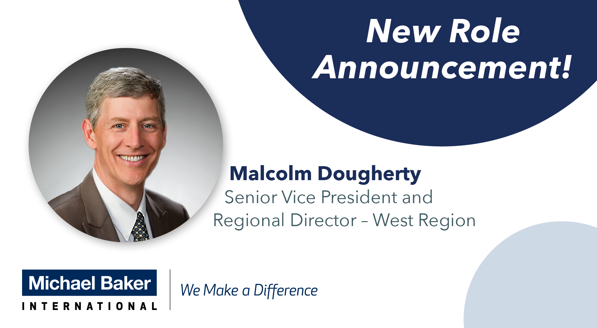 SANTA ANA, Calif. (September 1, 2021) – Michael Baker International, a global leader in engineering, planning and consulting services, announced today that Malcolm Dougherty, P.E., has been named Senior Vice President and Regional Director for the firm’s West Region. Mr. Dougherty will report to Brian A. Lutes, President and Chief Executive Officer, and will be based out of Michael Baker’s Santa Ana, California, office. He assumes the role from Michael J. Conaboy, P.E., who has been promoted to Executive Vice President and National Design-Build Executive.