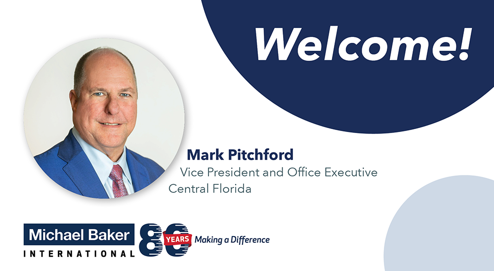 PITTSBURGH (May 21, 2020) – Michael Baker International, a global leader in engineering, planning and consulting services celebrating 80 Years of Making a Difference, announced today that Mark Pitchford, PSM, has joined the firm as Vice President and Office Executive in central Florida, overseeing the Orlando and Tampa offices. In his new role, Mr. Pitchford will be responsible for client care and overseeing the growth of the company’s portfolio of business in Central Florida, while broadening outreach to new markets and clients. Additionally, he will provide operational and staff management and production and project oversight for the offices. He will be based in Michael Baker’s Tampa location.