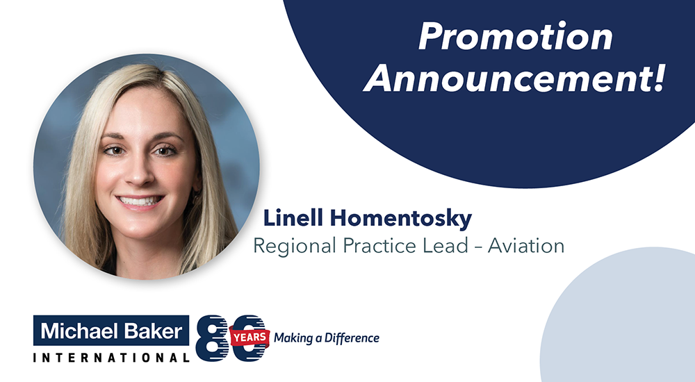 NEW YORK (December 4, 2020) – Michael Baker International, a global leader in engineering, planning and consulting services celebrating 80 Years of Making a Difference, announced today that Linell Homentosky has been promoted to Northeast Regional Practice Lead – Aviation. In this leadership role within Michael Baker’s Aviation practice, Ms. Homentosky will focus on sustaining and expanding the firm’s aviation services in the Northeast Region.