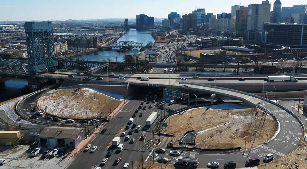 NJDOT studied the situation extensively and, in 2012, engaged Michael Baker International to design improvements to the interchange. The $95 million initiative would become one of Michael Baker’s most fascinating and successful projects, involving innovations to achieve multiple objectives: update all obsolete components: improve the interchange’s operational capacity without actually building new roadway; maintain traffic flow during construction; add the missing moves; rehabilitate and replace deteriorating structures; minimize impact to historic structures during and after construction; and avoid disturbances to the railroad tracks and the sewer system.