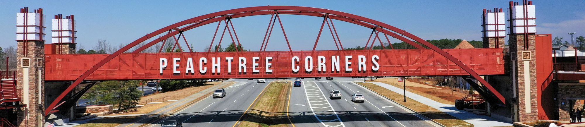 The Peachtree Parkway Pedestrian Bridge is a 190-foot-long truss arch that crosses over S.R. 141 (Peachtree Parkway), a four-lane highway with an average daily traffic of nearly 40,000 vehicles. The roadway links the suburbs with downtown Atlanta and connects the Forum, an existing shopping mall, with the Town Center, a new site that includes shopping, recreation, dining and residential space. Additionally, the location houses an amphitheater and green space. This pedestrian bridge serves not only as a connectivity point between the two developments but as a landmark and gateway to Peachtree Corners.