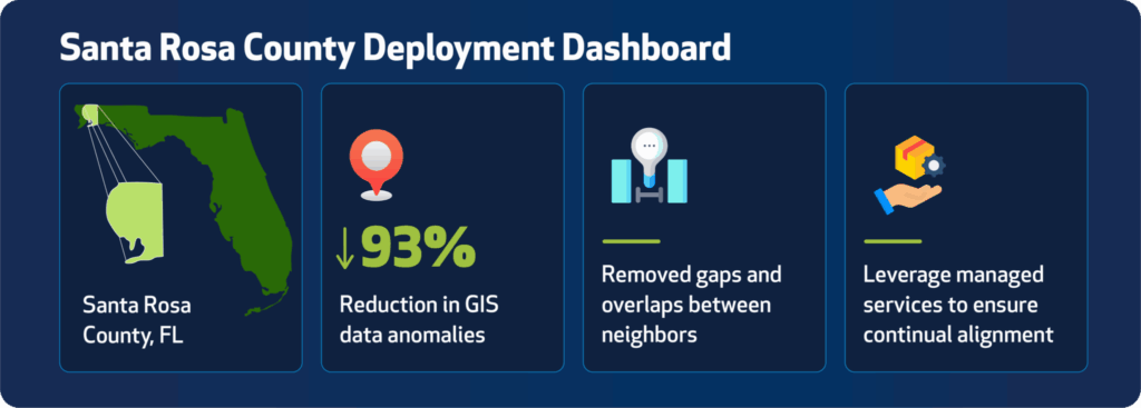 DATAMARK Technologies meticulously cleaned and standardized road centerlines, address points and emergency service boundaries, eliminating inconsistencies and gaps that could hinder emergency response. The team implemented robust quality assurance protocols and centralized data repositories, enabling seamless integration with regional Next Generation Core Services. By fostering collaboration and providing ongoing support, DATAMARK helped Santa Rosa County build a scalable model for GIS-driven innovation.